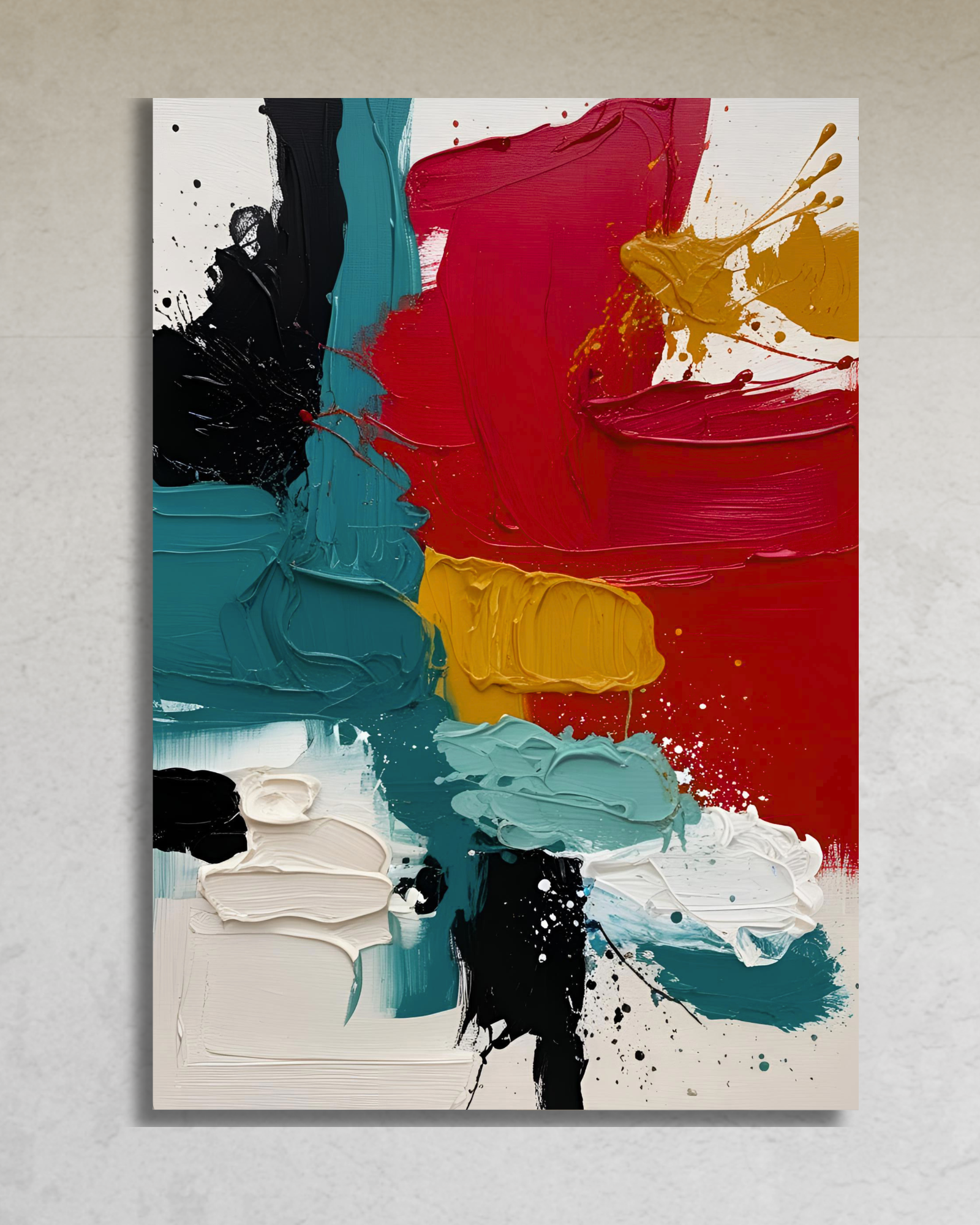 Rojo, mostaza y azul teal en composiciones llenas de energía.