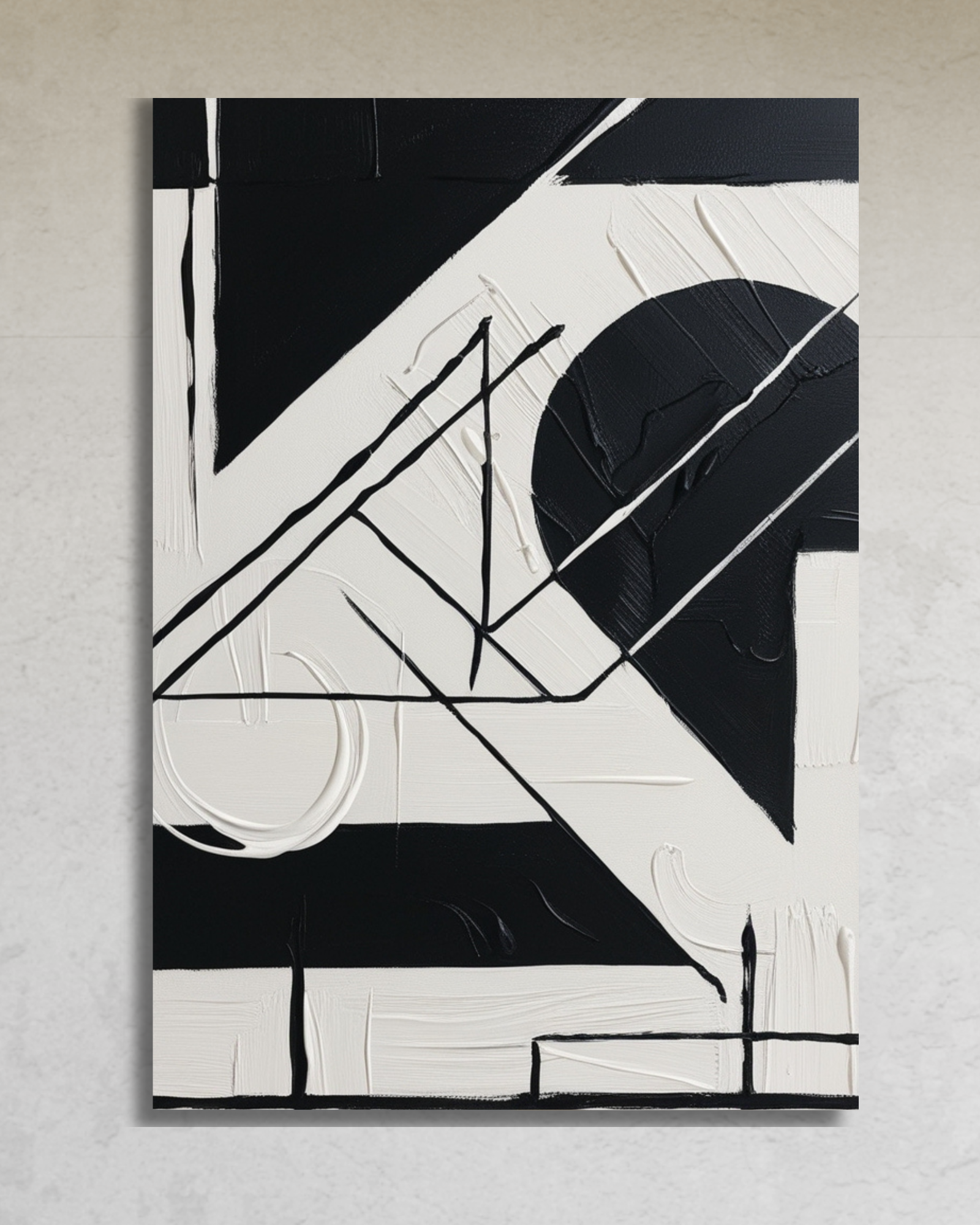 Blanco y negro en contraste fuerte, con formas geométricas y minimalismo.