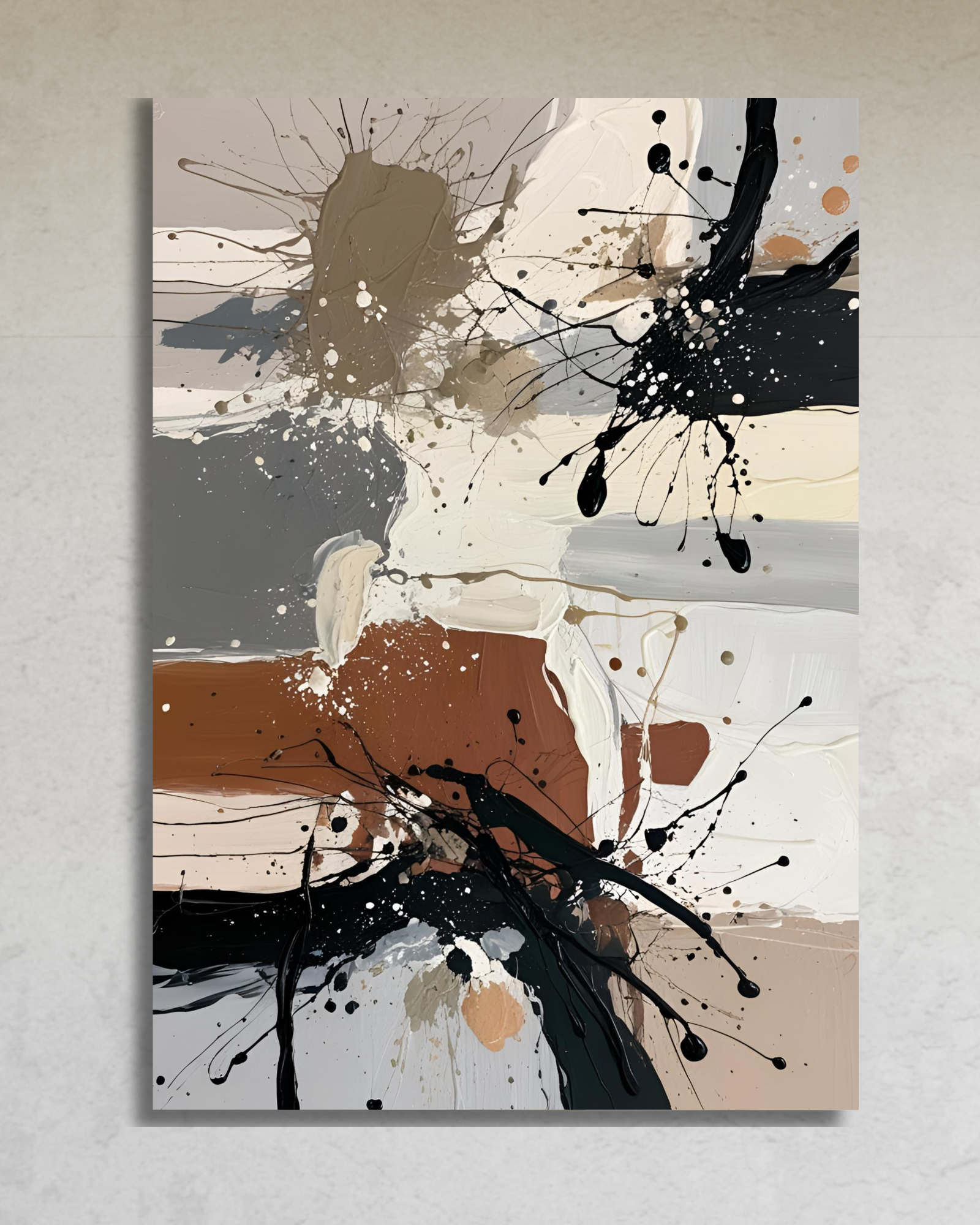 Tonos tierra como cremas y grises con texturas y trazos enérgicos.